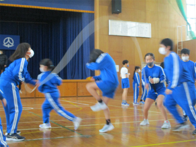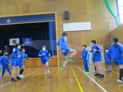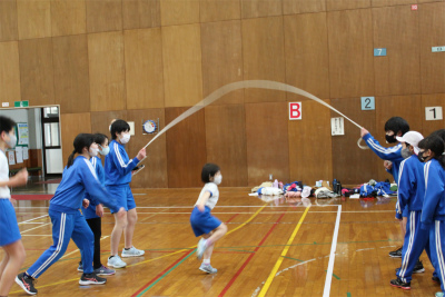 大縄跳び練習を始めた頃、怖くて跳べなかった1年生が、なんと上手に跳んでいます。絶妙なタイミングで、1年生の背中を押して合図する高学年の見事なこと!一人でタイミングをとって入れる子も増えました。