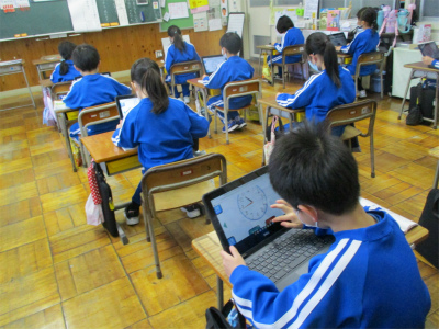 「時間は何時かな。」つい先日まで、担任の先生が「5のことろまで休み時間です。」と言っていたはずなのに、○時○分と読めています。算数教科書にあるQRコードを読み取りクロムブックで問題に答えています。