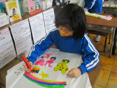 4限目は、生活科の「昔遊び」で「たこづくり」をしていました。寅年だから「トラの絵」を描いている子、好きな動物を描いている子、さすが内外海っ子です!海の中を描いている子もいました。今日で「たこづくり」が終わりました。今度は、外で飛ばせるかなあ。(今日の猛吹雪では無理ですね。)難しいたこ糸を結ぶところを分かっている友達が分からない友達に教えています。すっかりお兄さんお姉さんになった1年生です。