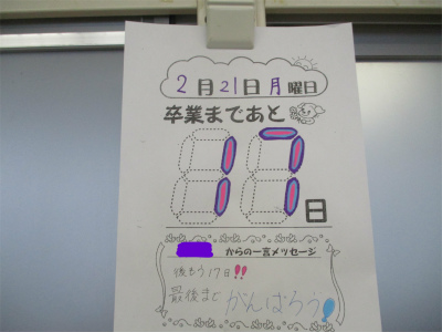 2月21日、月曜日。昨日、17日間の熱戦が繰り広げられた北京オリンピックが終わりました。今日は、内外海地区は暴風雪です。時々、猛吹雪で外が真っ白に見えます。さて、6年生のカウントダウンカレンダーの日にちは17日です。学校に来る日も2週間と少しになりました。