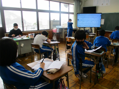 6年教室では、算数プリントの答え合わせをしていました。自分のプリントを投影機で画面に映し出していました。6年間の算数のまとめはできていますか。