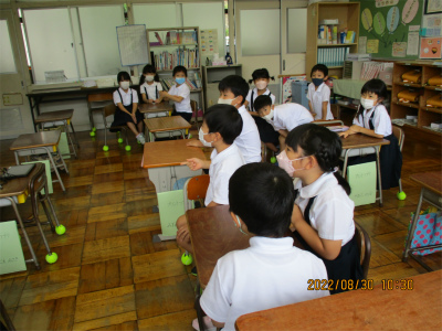 1年生は、グループ学習(話し合い)の入門編「なーんだなんだ・はんかいぎ」をしていました。担任が選んだおはじきの色を当てるゲーム感覚の班会議です。1年生ながら、先生の心理を読み取って、「次は、違う色選ぶはず!」などと言いながら意見交換している姿はほほえましかったです。