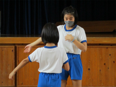 さて、応援練習の後は、業間の時間を使って、外で(台風なんて何のその!)よさこい練習です。