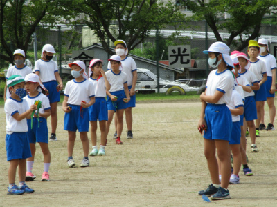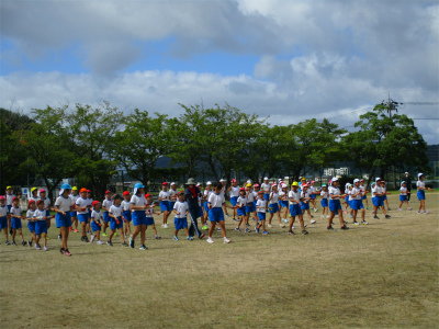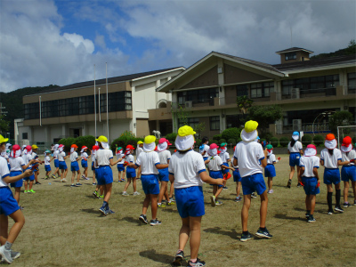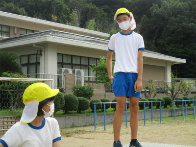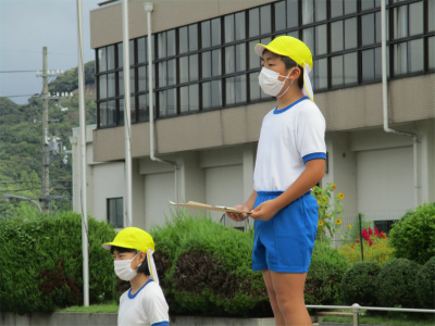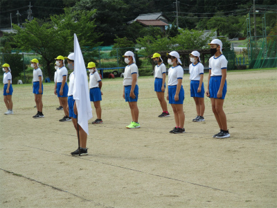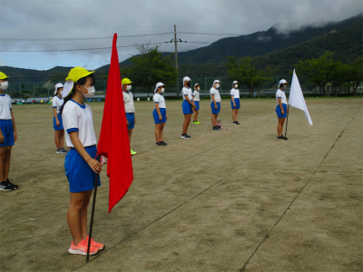 9月7日、水曜日。本日1時間目から、6年生が体育大会開閉会式の練習をしていました。今日、初めての練習です。
