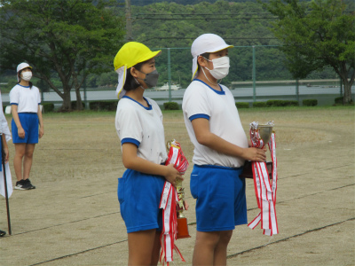 優勝カップ(競技の部・応援の部)返還。「また、自分たちの色に戻ってきてね。」と心で声をかけます。