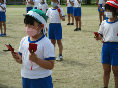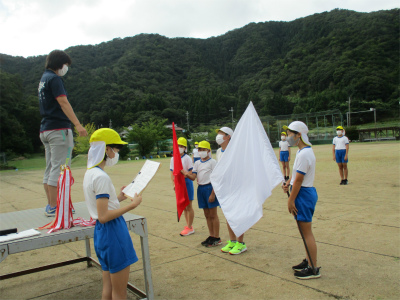 開式の言葉も閉式の言葉も、児童が担当します。堂々と言えたかな?紅白の団旗を持っているのが今年の応援団長です。