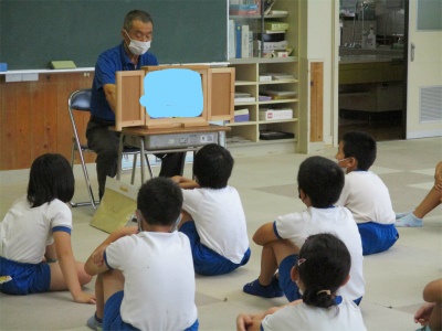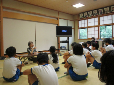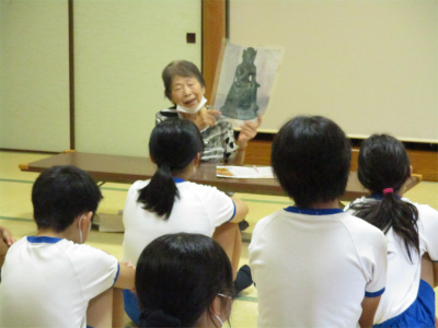 5・6年生は、語り部の方に「仏谷地区」のお話をしていただきました。ビデオを鑑賞しながらの話の予定でしたが、うまく映像が出なかったとのことで、仏像の写真を見せていただきました。