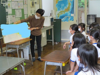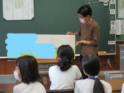 9月8日、木曜日。今朝は2学期初めての「読み聞かせ」がありました。4名のボランティアの方々にお世話になりました。朝のひととき!どっぷりと本の世界に入り込みました。(※今まで著作権を考えていませんでした。異様な感じがしますが、本の部分は隠しました。)