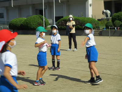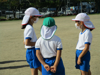 絶好の天気です。まずは、3人1組で走る順番を決めて、襷渡しの練習をしました。