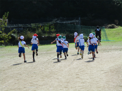 10月13日木曜日。あさって15日(土)、いよいろ駅伝本番です。今日の2時間目は、1年2年生が体育の時間を使って、駅伝練習をしていました。3人1組でチームを組み、実際の襷(たすき)を使って受け渡しも練習しました。