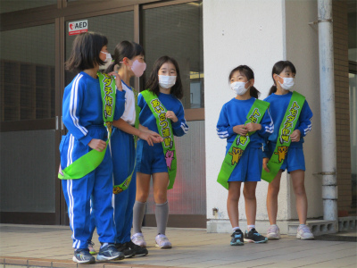 今日のあいさつ当番の2年生です。「おはようございます。」大きな声ですね。学校の外でもこのような元気なあいさつができたら100点満点!