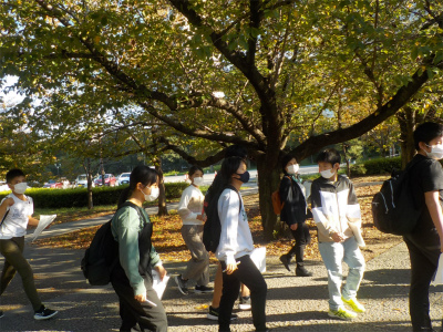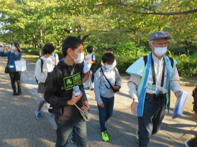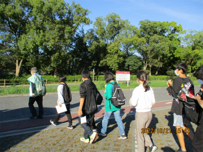 大阪城では、ボランティアガイドさんから天守閣の周囲の話をうかがいました。特に、石垣のことではいろいろと教えていただきました。多くの巨石があり、当時の権力がいかに強かったかが理解できました。「刻印石」という自分の藩が納めたことが分かるように藩の印があったり、36畳の広さの巨石があったりとあまり気にかけない石垣のおもしろさを学びました。今後、歴史で豊臣や徳川の時代を学んでいきますが、興味がわいた子もいたかもしれません。