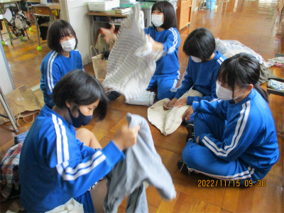 さて、6年生は、学習発表会プレゼン用の資料づくりと集めた古着のリサイクル作業を同時進行で行っていました。