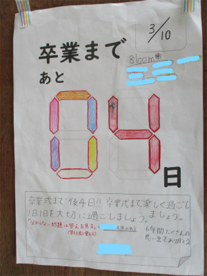 3月10日金曜日。今日の6年生教室カウントダウンカレンダーは4日です。来週、いよいよ卒業式です。6年生と一緒に学校で活動できる日も残り少なくなりました。さて、今日から、在校生の卒業式練習が始まりました。