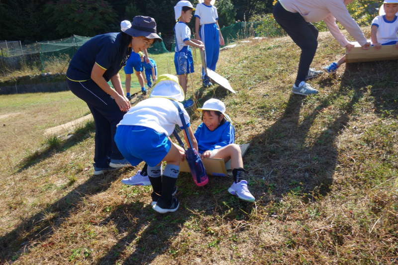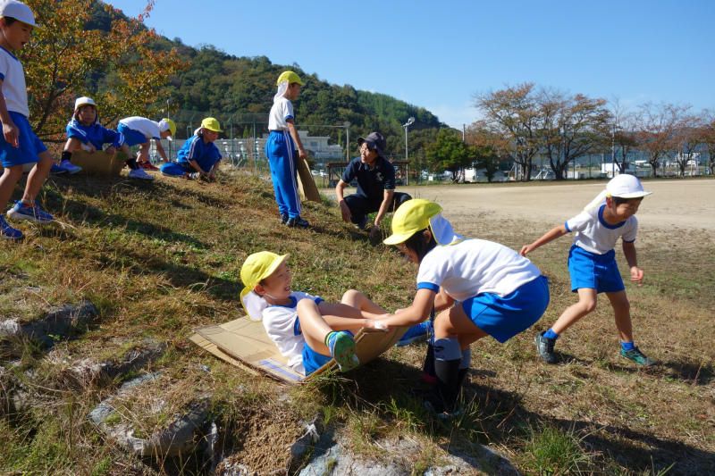 業間の時間、1年生が段ボールを手に、急いで玄関に来たので、「どうした?」と聞くと、段ボールを使って坂ですべるとのこと。急いでカメラを持ってグラウンドにでました。