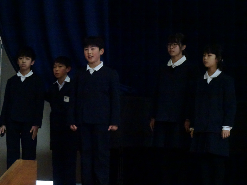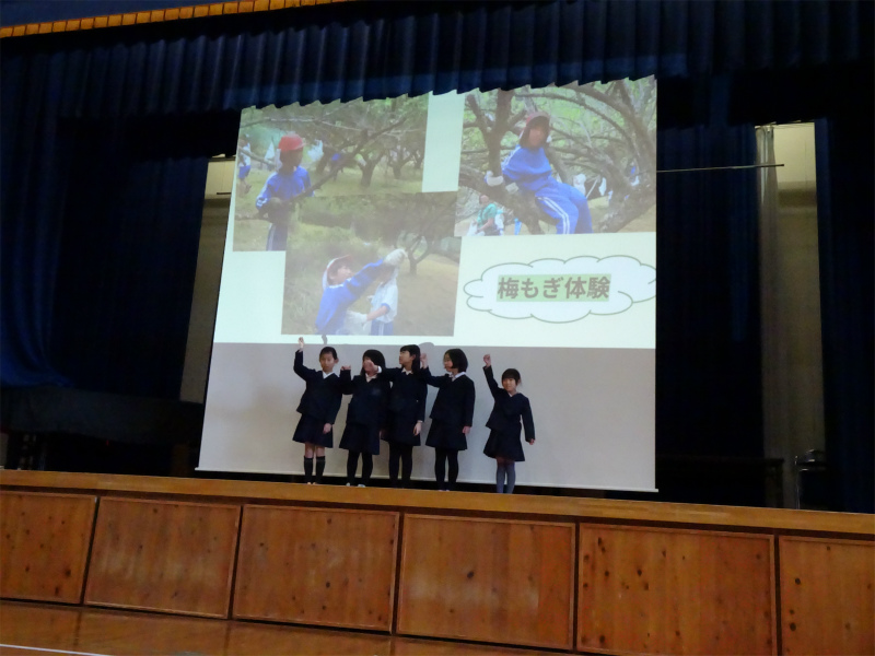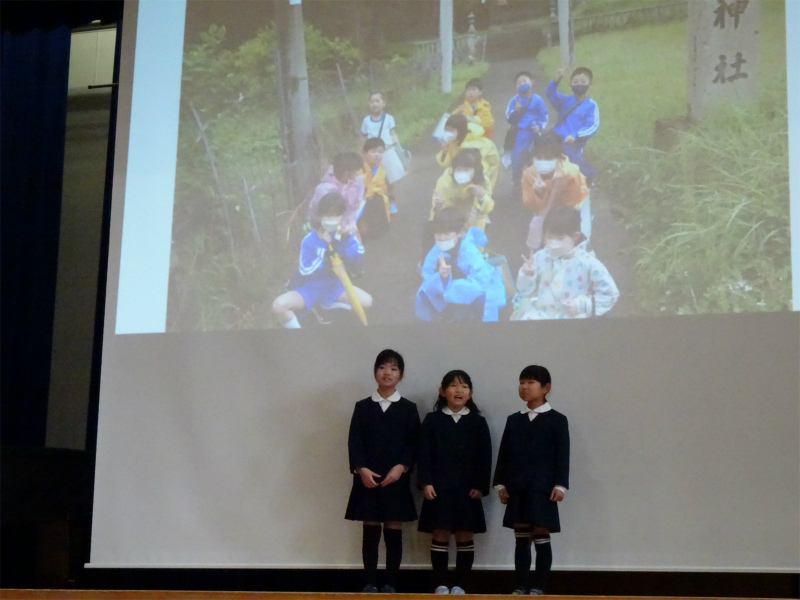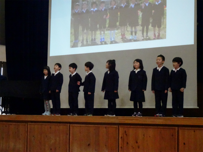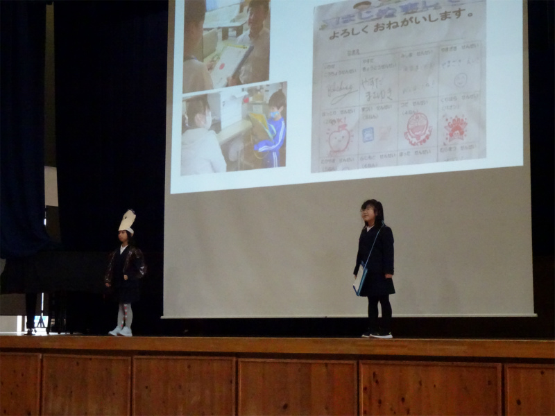 1年生の発表です。「どきどき わくわく 1年生」内外海の人や自然と仲良くなったことを報告しました。猿の劇が楽しかったです。