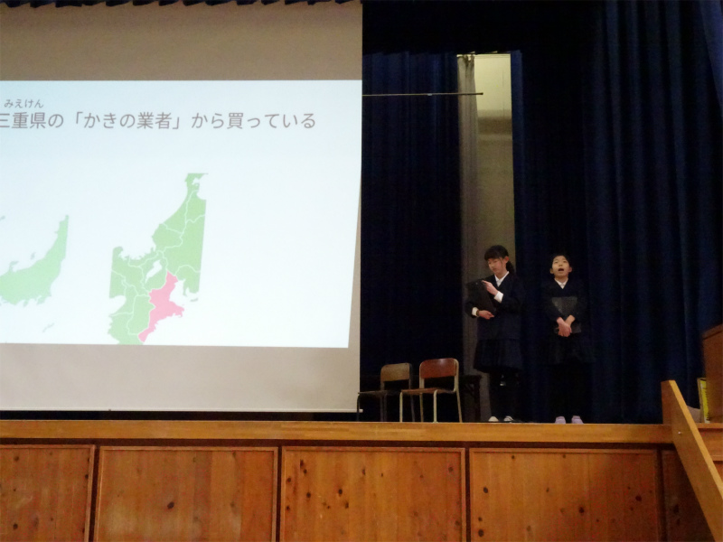 4年生の発表です。「内外海の自然に向き合おう!」山・川・海のつながりについて学んだことや、牡蠣の養殖等について報告しました。