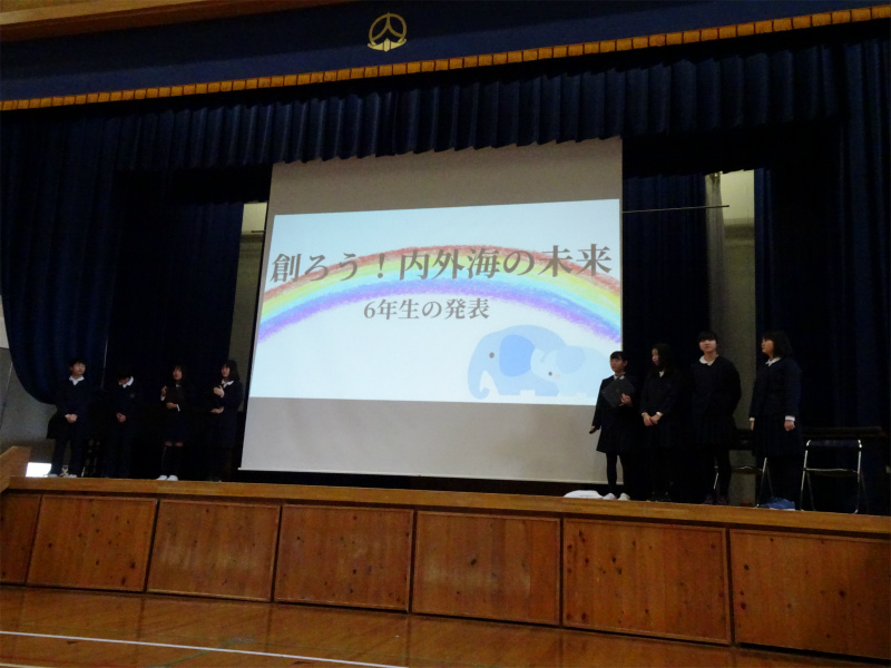 1年間の学習の成果を発表する、学習発表会を行いました。それぞれが学んだことを工夫しながら、みんなに丁寧に伝えていました。特に、ふるさと学習の成果報告が多くあり、発表することで、また、発表を聞くことでさらに内外海が好きになったのではないでしょうか。内外海地区には、ふるさと学習の素材が豊富です。豊かな”内外海の恵み”に改めて気づかされた発表会でした。支えて頂いた地域の方、保護者の方々に感謝です。