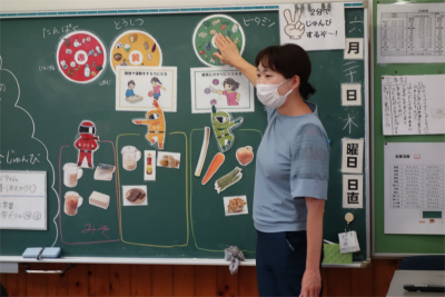 3年学級活動で、M栄養教諭さんから「食べ物の働きを知ってのこさずたべよう」の授業をしてもらいました。みんな楽しく、バランスの良い食事と栄養の働きを勉強していました。