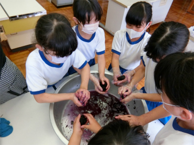 ゲストティーチャーのO先生にお世話になり、1.2年生が梅干し作りを行いました。