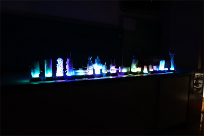 理科室のカーテンを閉め、真っ暗にして自分達の作品を鑑賞していました。スポンジで作った作品にLEDの光を当てます。どんな感じになるかなあ?