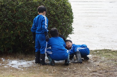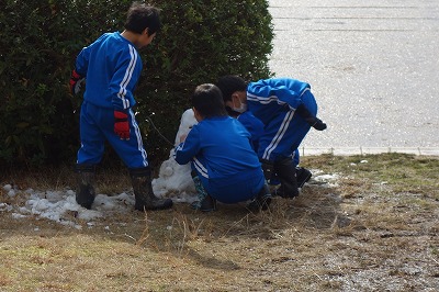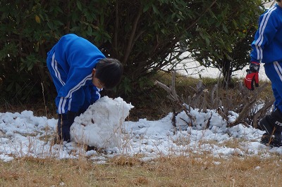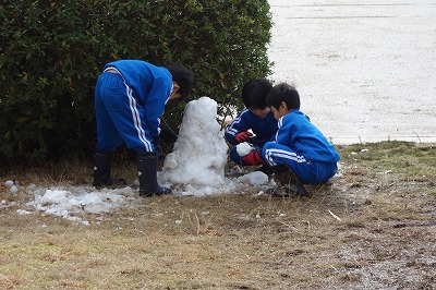 先週の雪の日のことです。外は、うっすらと雪が積もっています。お昼休みになると早速外に出て雪遊びが始まりました。