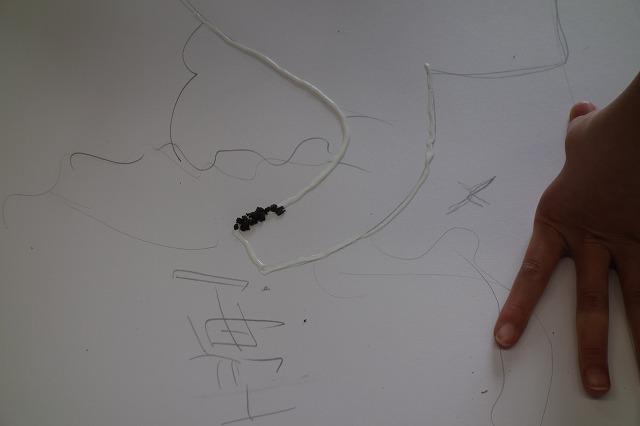 スチレンボードに下絵を描き、色を乗せたいところに木工ボンドをつけ、チップを乗せます