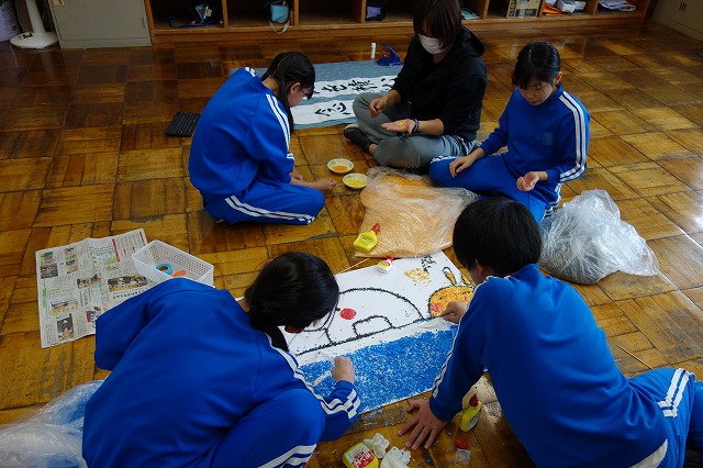 志積海岸で拾った海ゴミのプラを細かく砕いたチップを使って5年生がアート作品制作に挑戦です。砂絵のように、ボンドでチップを貼り付けています。