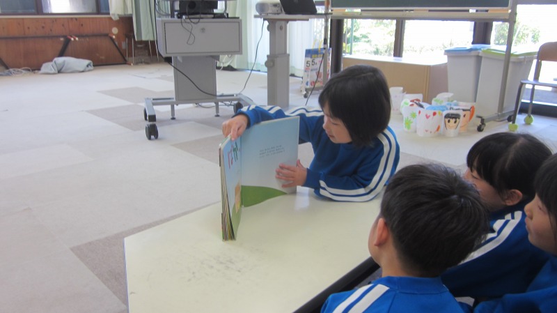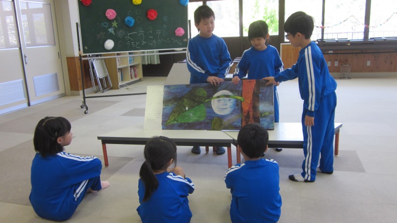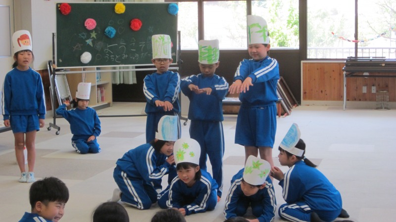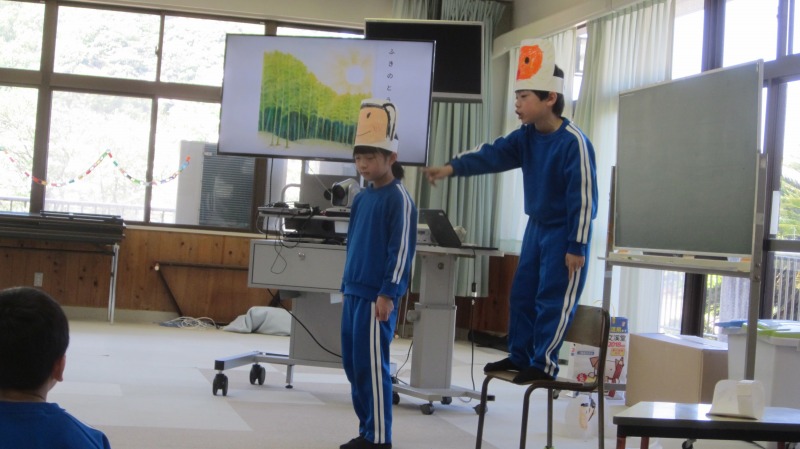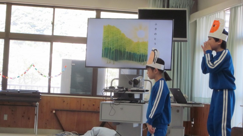 音読劇「ふきのとう」を披露するときは、役になりきって発表していました。かわいいお面も1年生の注目を集めていました。
