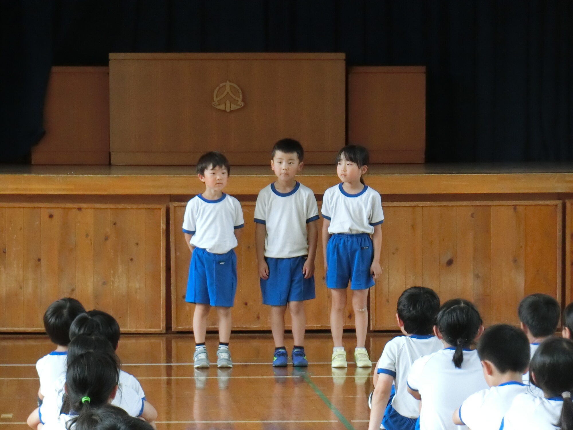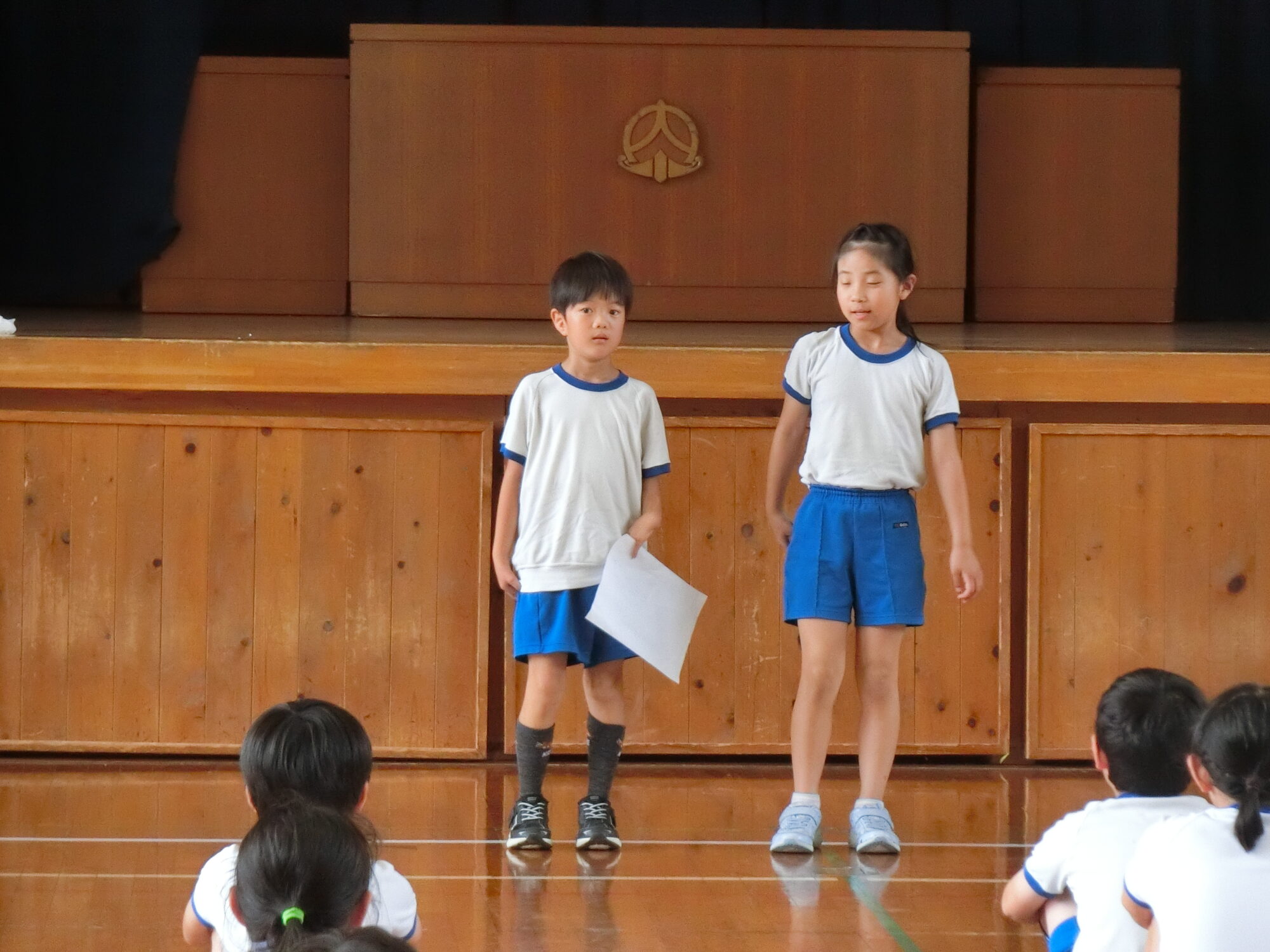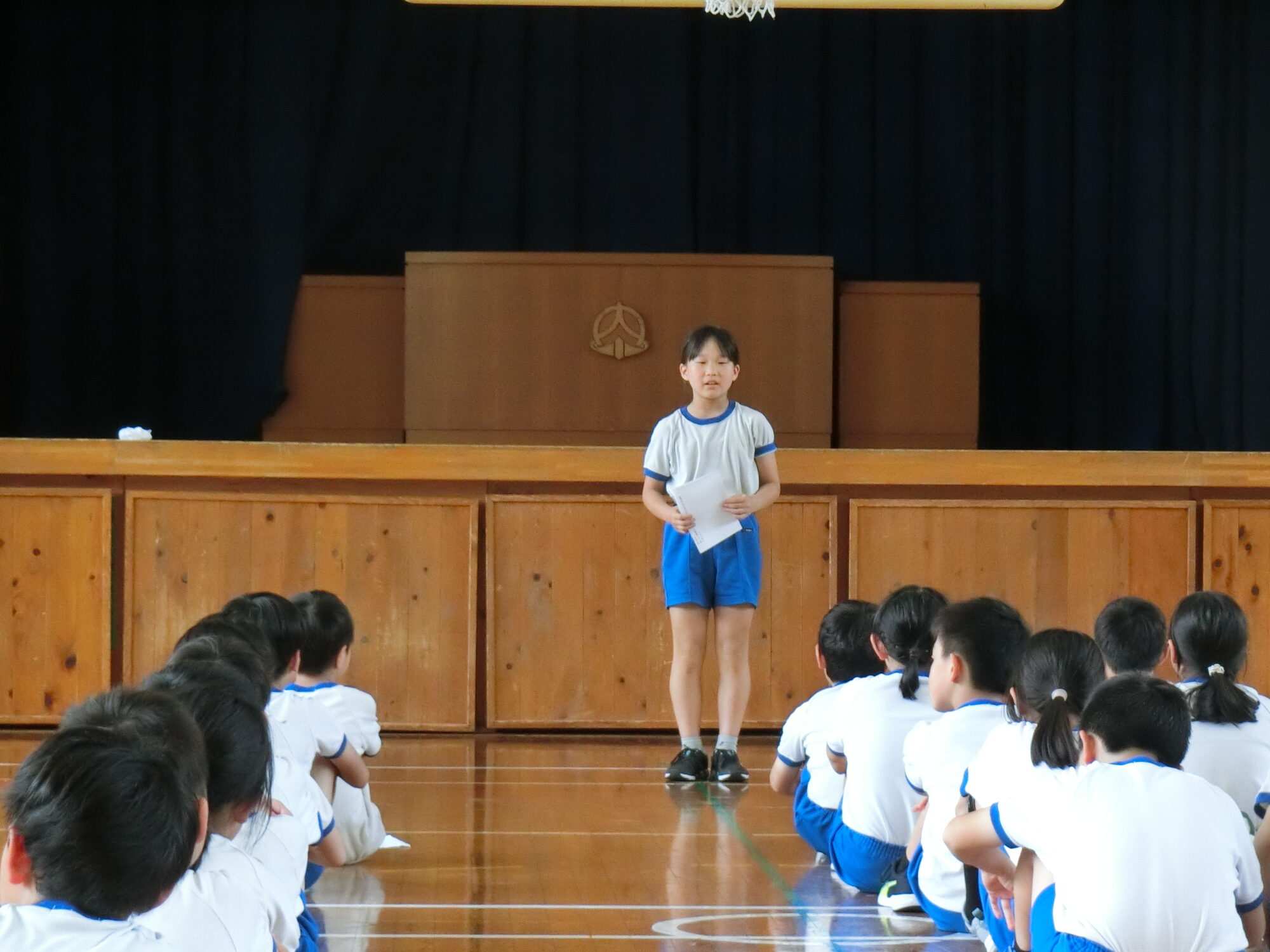 5月21日に生活委員会企画の児童集会を行いました。生活目標の「自分から進んであいさつしよう」についてふり返りました。 各学級で話し合ったことを代表の児童が発表します。「あいさつができた」と成果が発表された一方で、「自分から」「進んで」「声の大きさ」についてはまだ不十分であるという反省も報告されました。