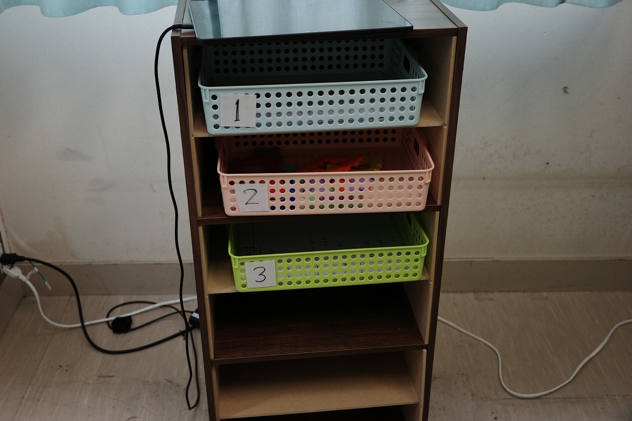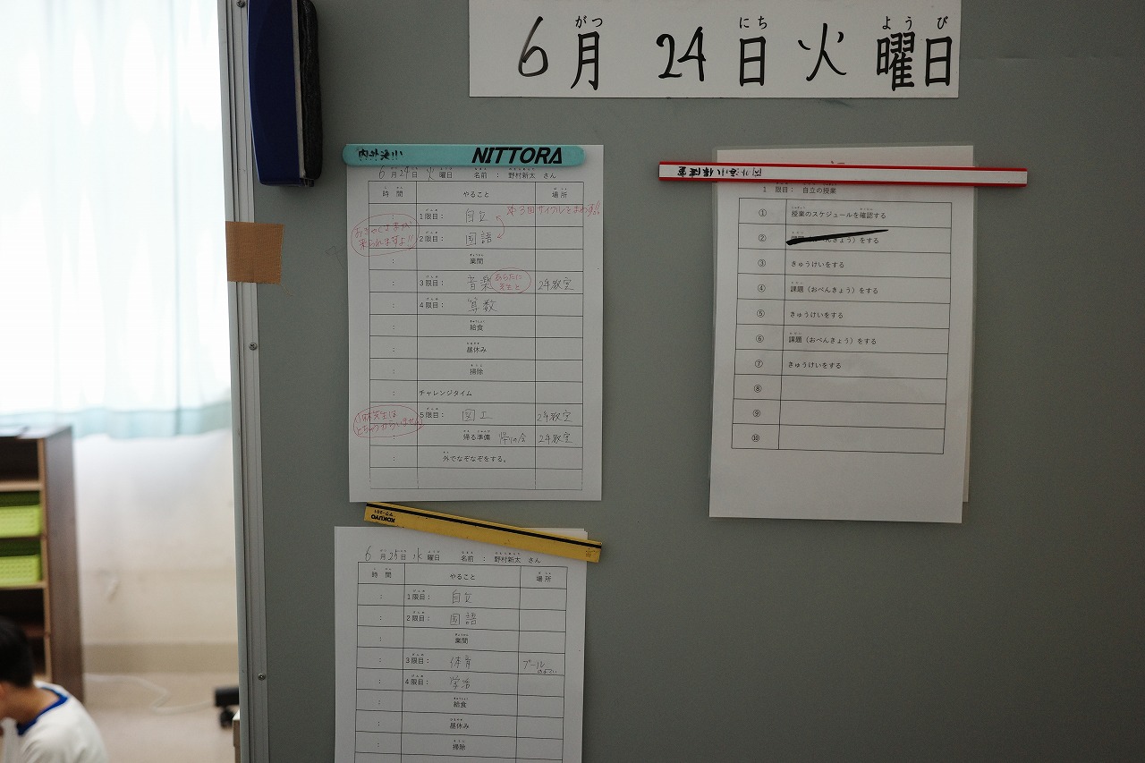 6月24日に特別支援学級の授業を教職員が参観しました。特別支援学級に限らず、本校では各学級の授業を教職員が互いに参観し、改善を図っています。パオン学級では、1日の流れがつかみやすいようにスケジュール表が掲示されていたり、自分で学習に取り組みやすいようにプリントが「1」「2」「3」と表示した棚のかごに置かれていたりします。