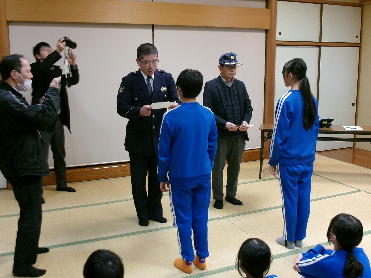 11月26日、小浜警察署、交通安全協会の方が来校され、5・6年生へ「リュウピー・リュウミー交通保安官」の任命書の伝達がありました。