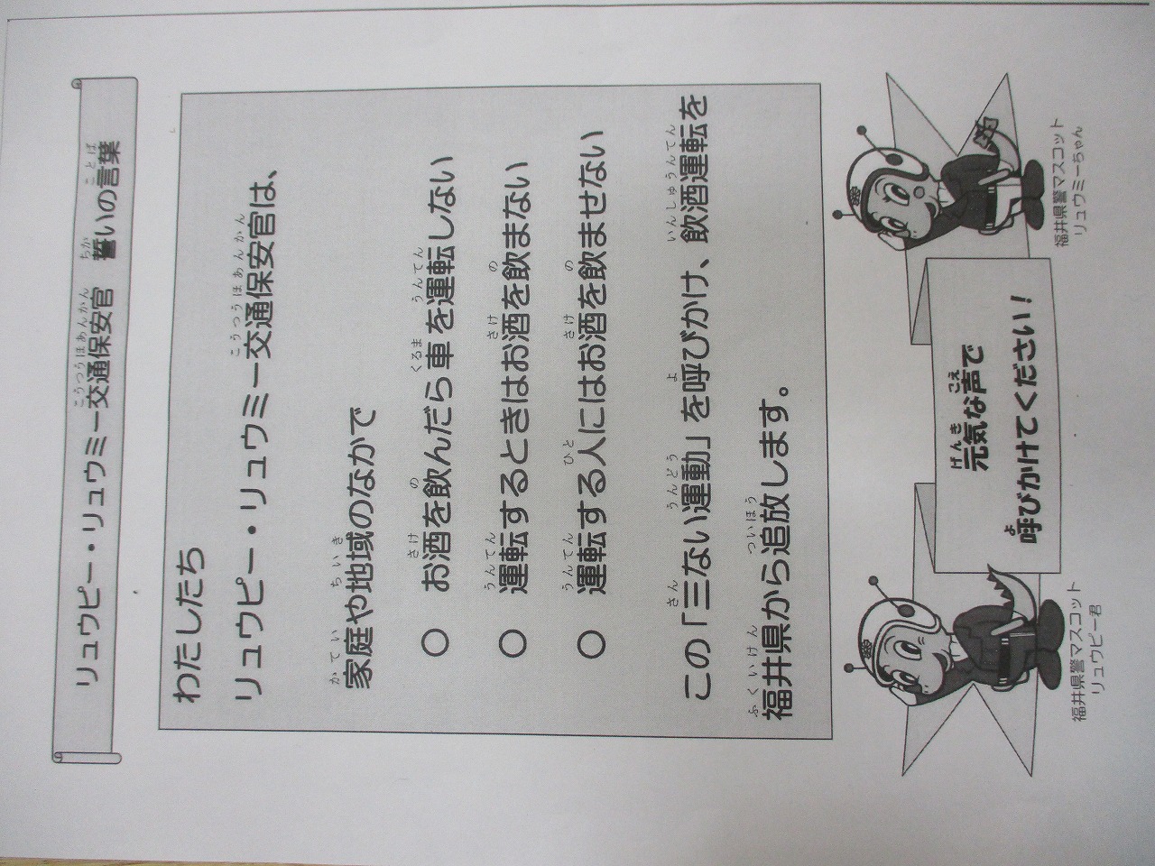この交通保安官は、家庭や地域の中で「お酒を飲んだら車に乗らない」「運転するときはお酒を飲まない」「運転する人にはお酒を飲ませない」という「三ない運動」を呼びかけ、飲酒運転を追放する活動をしていくというものです。