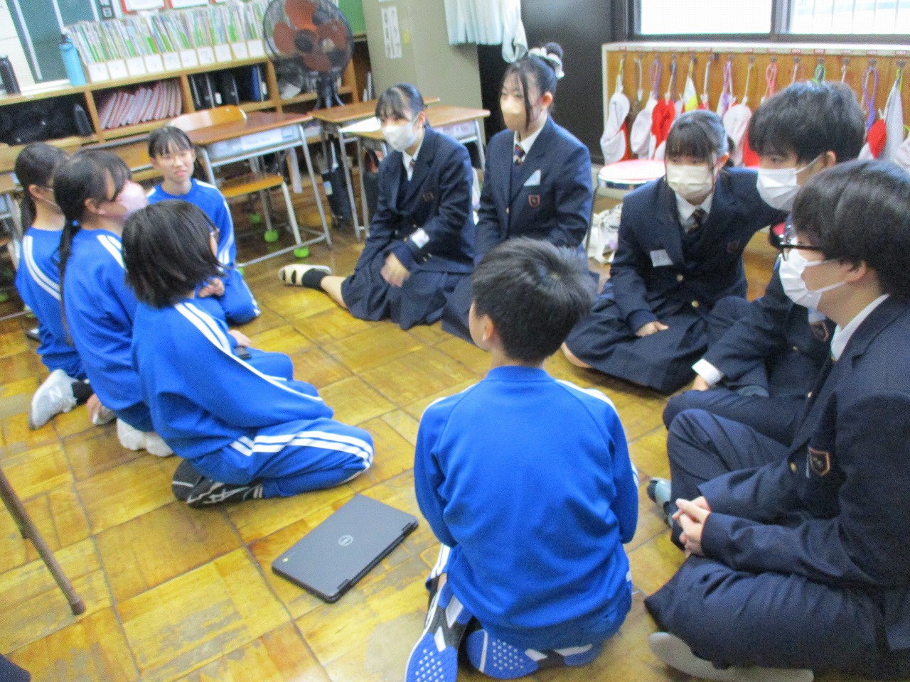 高校生29名が、4~6年教室に分かれて入ってくれました。各学年の話題に沿って対話が始まりました。