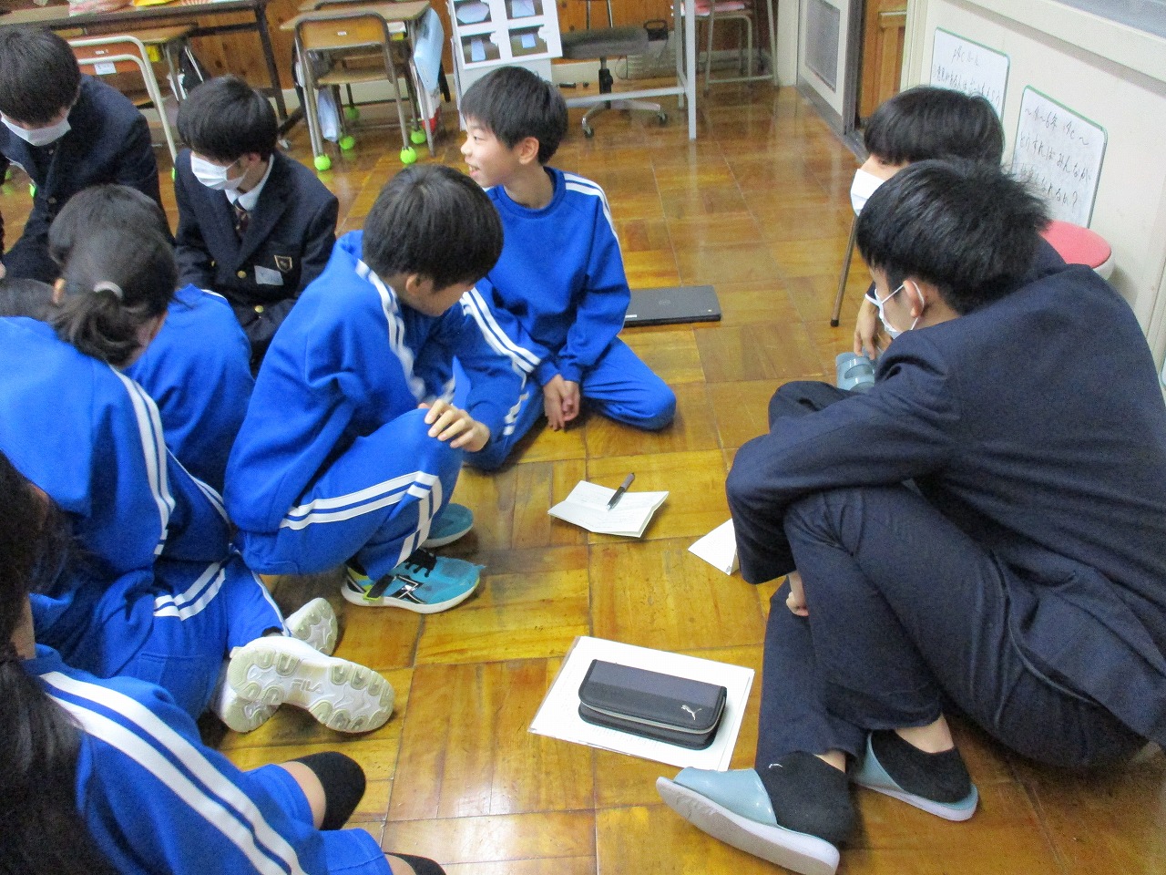 11月28日、若狭高校の3年生の生徒さんが来校され、本校の4~6年生と高p4c対話を行いました。