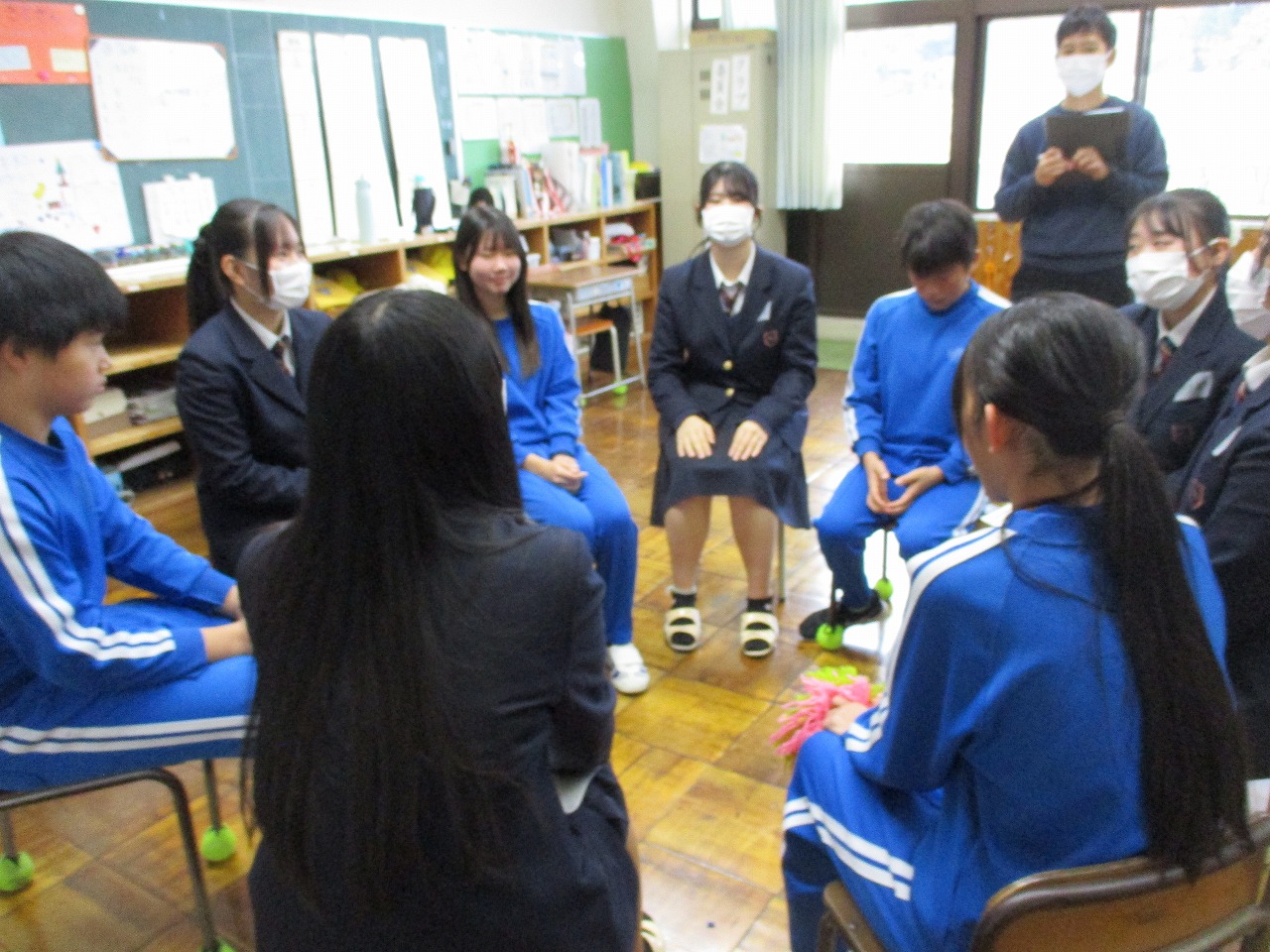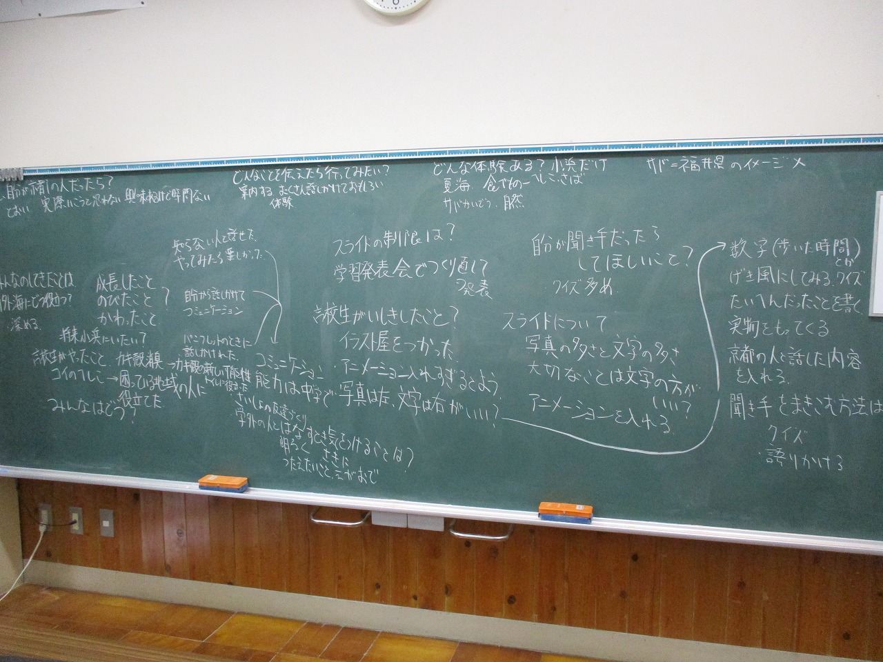 自分たちの学習をわかってもらえるように説明したり、質問に答えたりするのは、緊張している様子でしたが、高校生が温かく、話しやすい雰囲気を作ってくれたため、だんだんいい雰囲気で話が続きました。「将来、小浜に残りたい?」というテーマで語り合っている教室もありました。