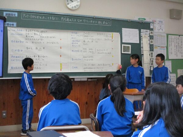 クイズ形式で質問があり、6年生は自分の考えを発表しました。
