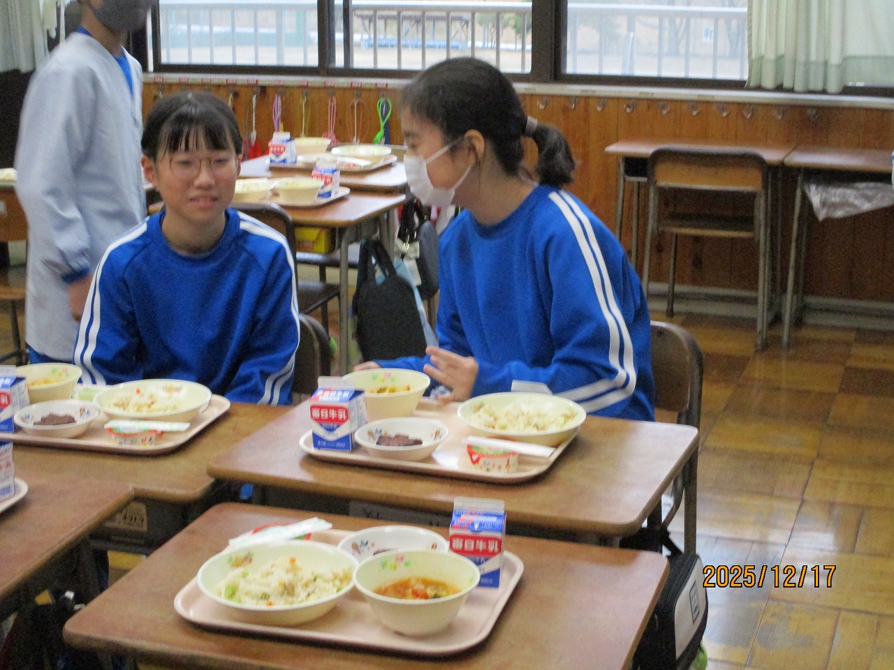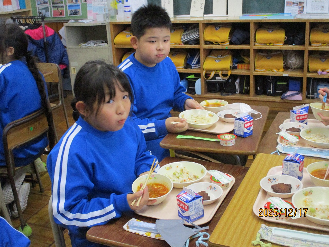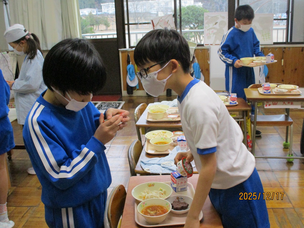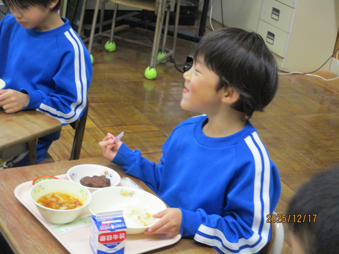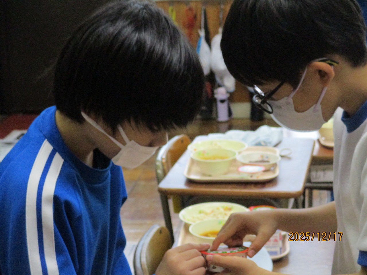 「クリスマスデザートのふたに何か書いてあるよ」「クイズだ!」2年生教室では、配膳された給食に興味津々です。