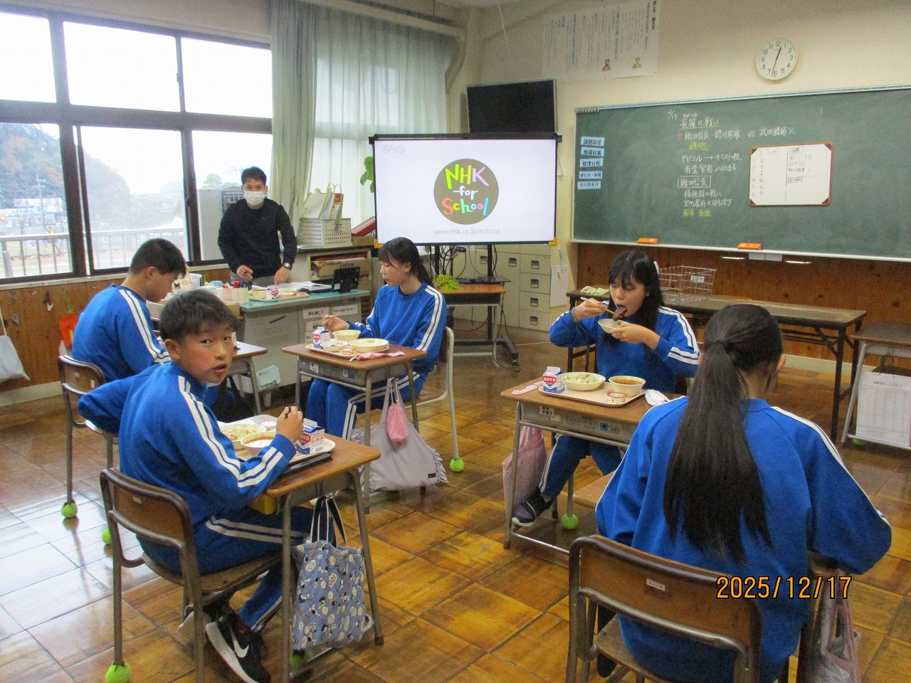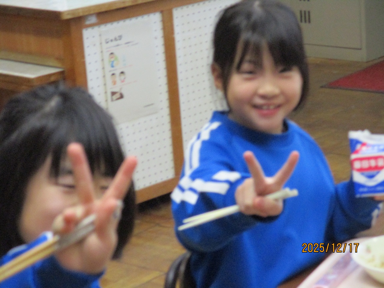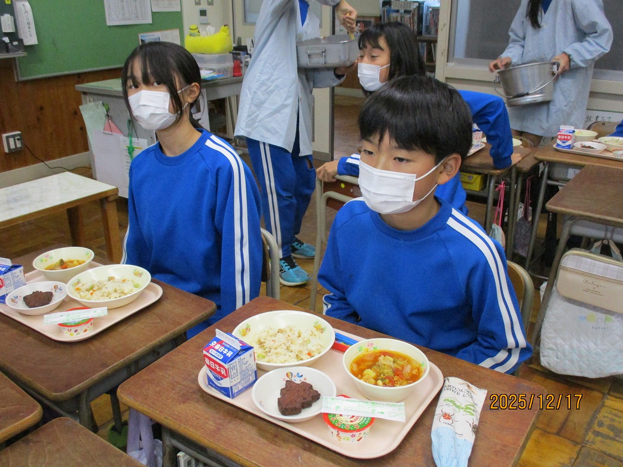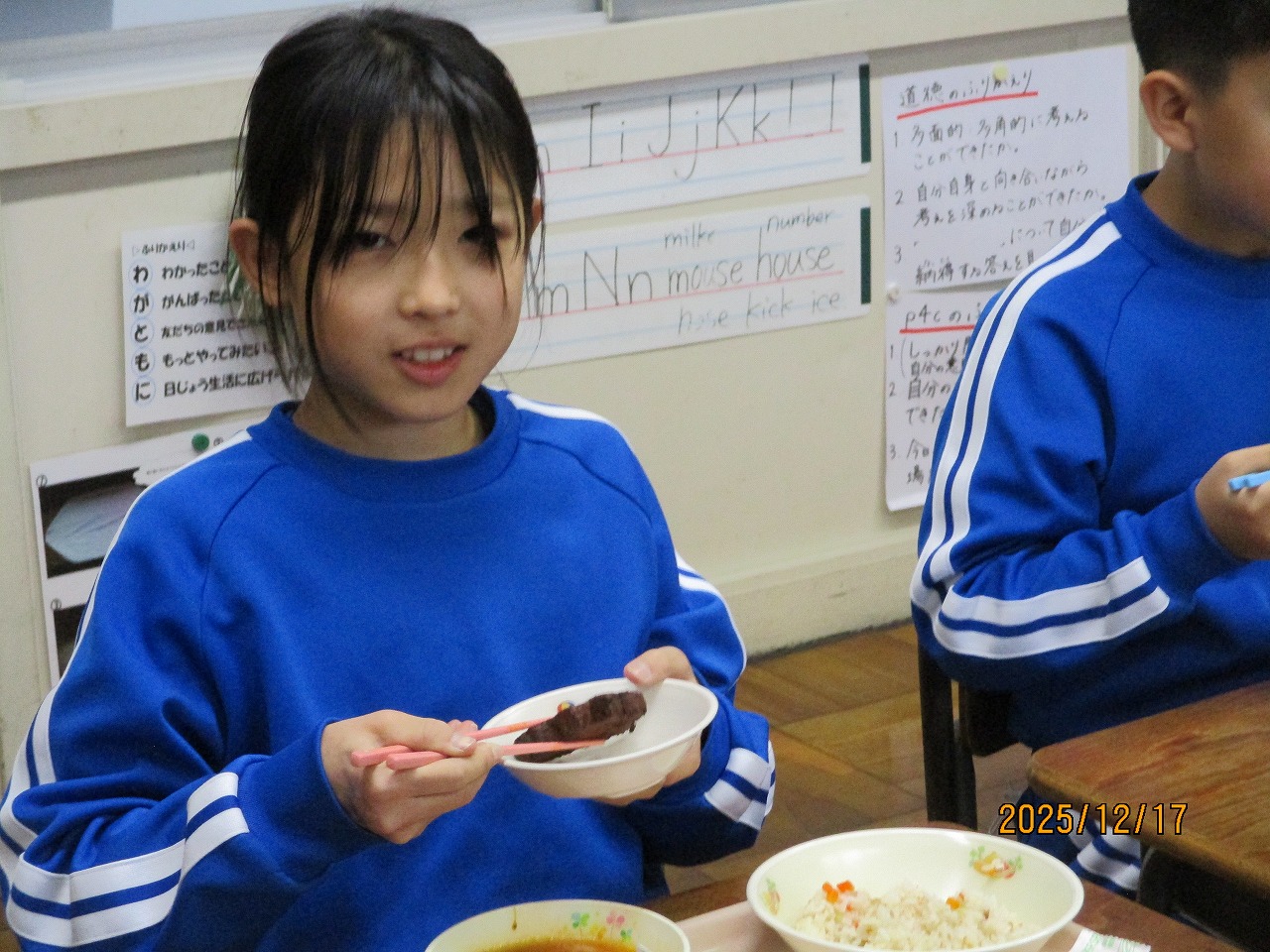 子どもたちはふだんから給食の時間をとても楽しみにしていますが、この日はさらに各教室で笑顔が広がっていました。