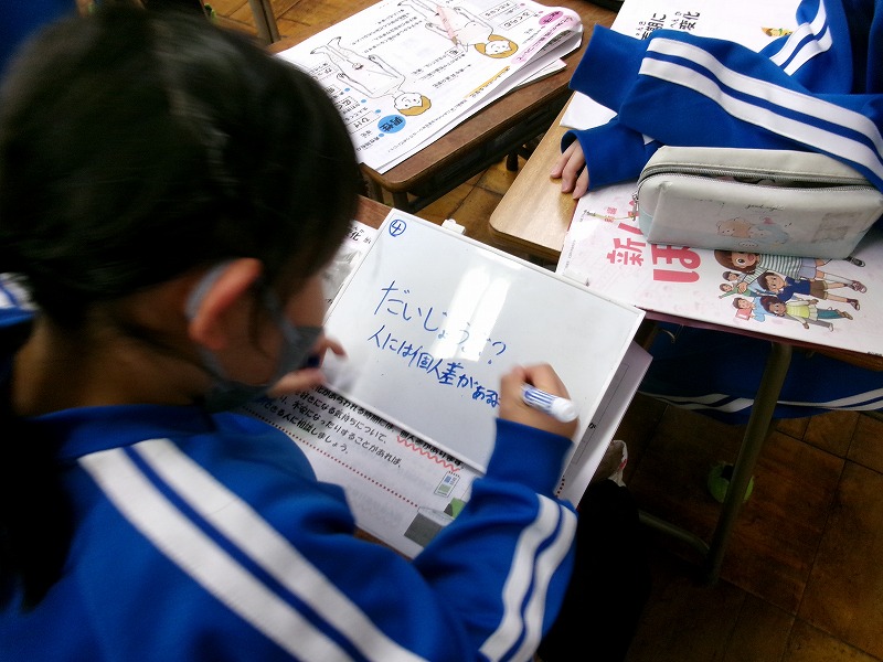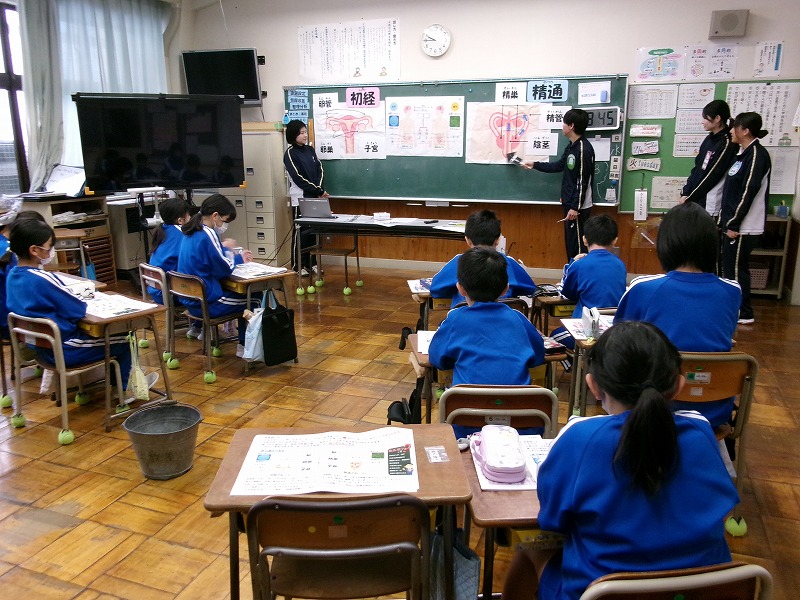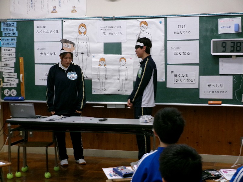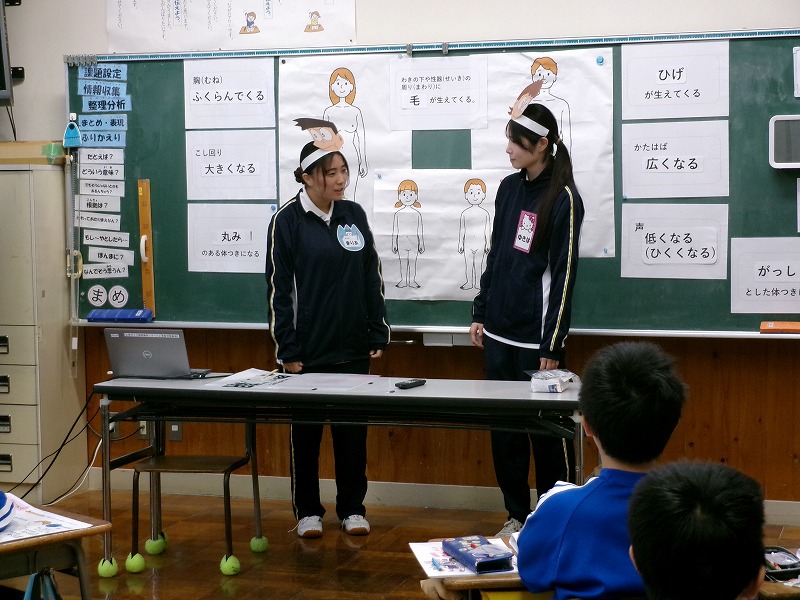 体の外側に見える変化、内側に起こる体の働きの変化、心の変化について、手作りの資料をもとに説明を受けました。
