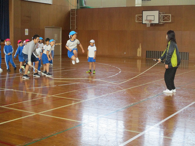 終わった後に、先生に「ひっかからずに〇分跳べました!」と報告があったり、跳び方のコツについてアドバイスを求めたりしている子もいます。この日は7分跳び終わったばかりの先生に子どもたちが集まってきていました。