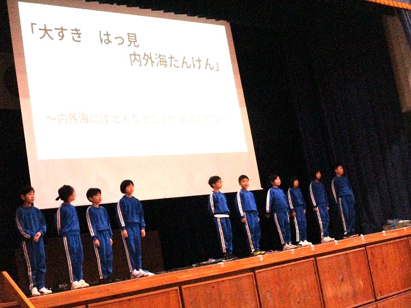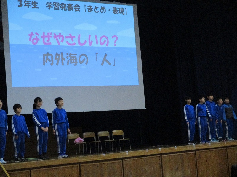 3年生は、「なぜやさしいの?内外海の人」と題し、地域の方にインタビューしたことを中心に発表しました。インタビューの答えから気づいたこと、導き出したことを取り入れた「内外海ハッピーソング」も披露しました。