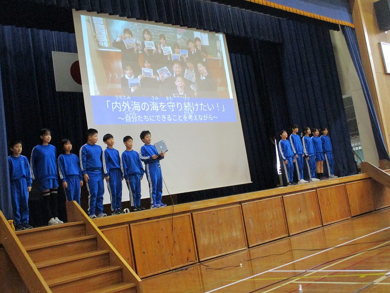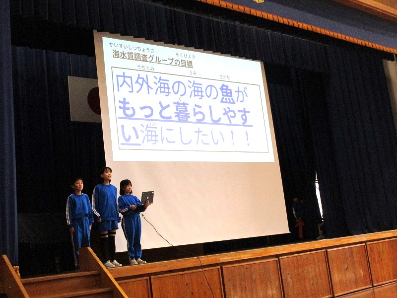 4年生のタイトルは「内外海の海を守り続けたい!~自分たちでできることを考えながら~」です。「漁業班」「海水質調査班」「海ごみ班」の3つの班に分かれて「問い→情報収集→整理分析→ふりかえり」をしてきた報告をしました。学習に必要とされている「探究サイクル」が回せており、素晴らしい成長です。