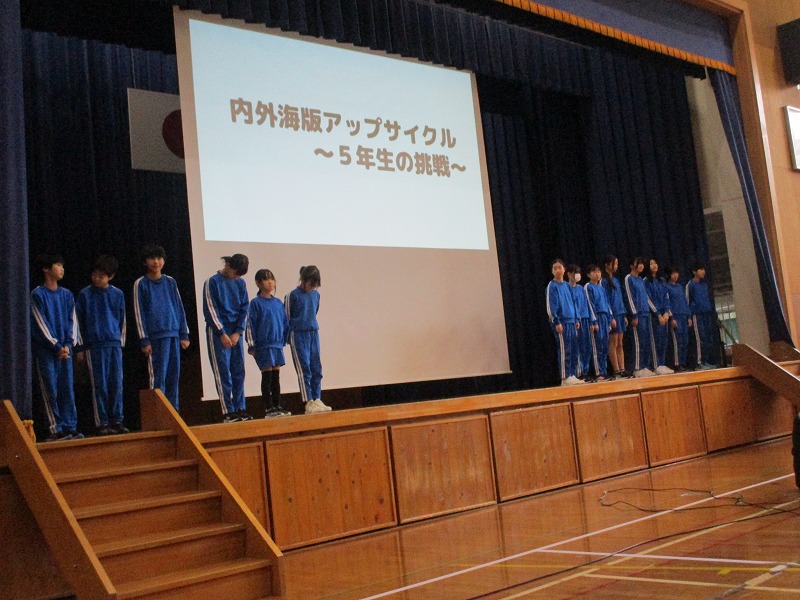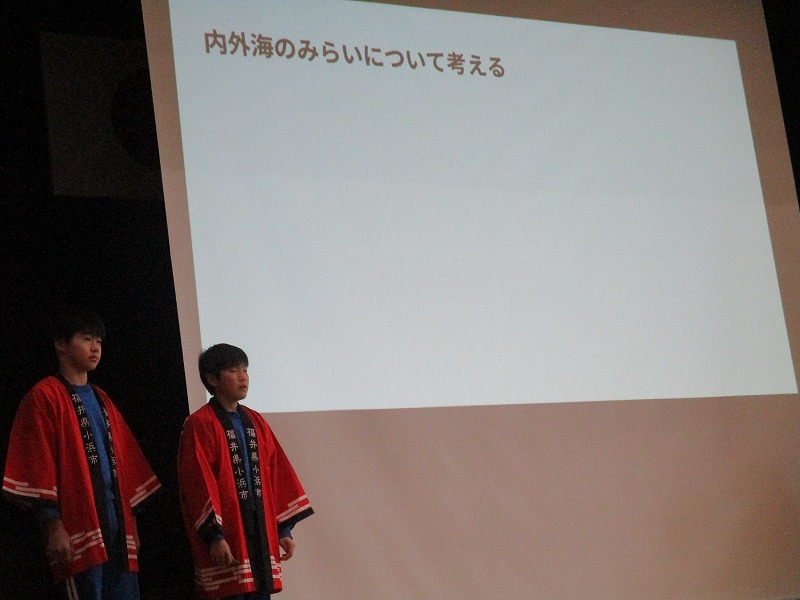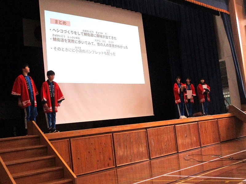 6年生は「創ろう!内外海の未来」というテーマで、鯖街道踏破体験や修学旅行の報告をしました。修学旅行時の販売活動で使ったはっぴ姿で、動画も見せながら感想を話しました。商品を完売できたという報告は下級生からも「すごい」と評価されていました。