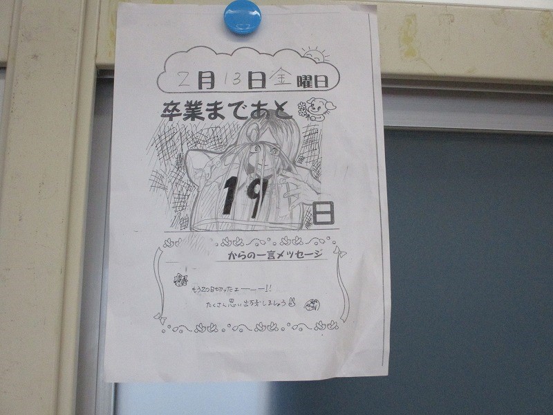6年教室には、「卒業まで19日」のカウントダウンカレンダーが掲げられていました。作成者から「もう20日切ったよー。たくさん思い出残しましょう!」とメッセージが書かれています。この日の朝のことも小学校生活の何気ない思い出の1ページとなったことでしょう。
