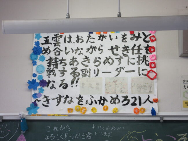 朝の会ではさっそくそれぞれのクラスの学級目標を唱和。21人だった5年雲組は今日から「きずなをふかめる22人」になることも確認していました。