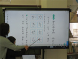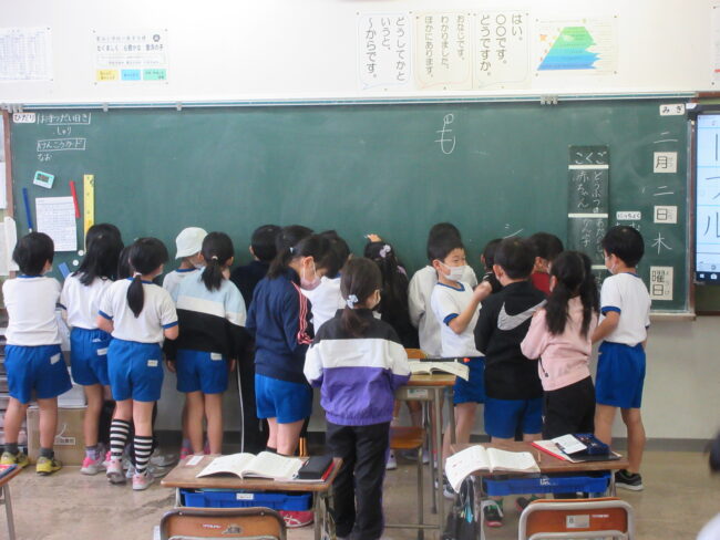 1年生の教室ではひらがなとカタカナの字の形の違いをみんなで見つけていました。