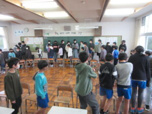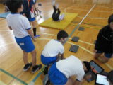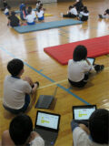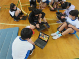 体育館のWi-Fiが整備されたため、さっそく授業でも活用しています。5年生の体育ではマットの練習の最中でした。