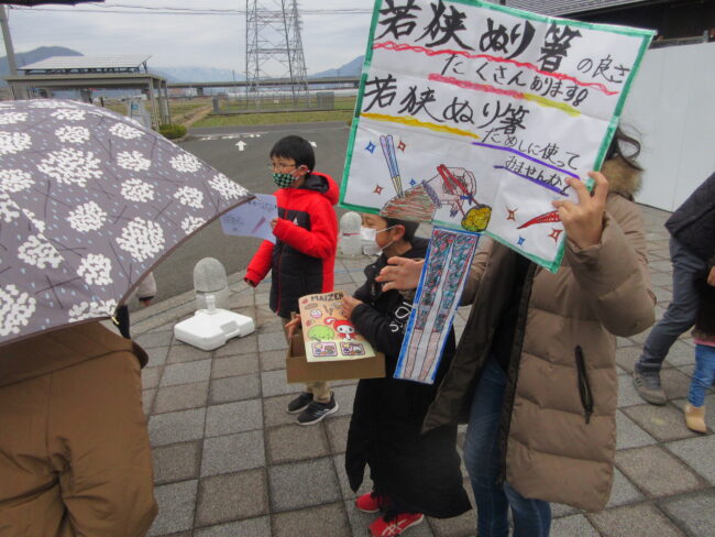 また、保護者以外の一般の方にも声をかけて若狭塗り箸の良さを伝えるグループもありました。