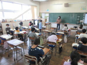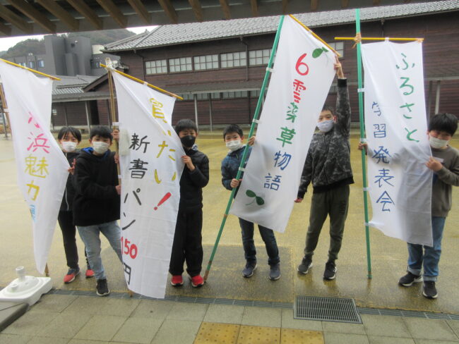 今日は朝から小雨の降る寒いあいにくのお天気になりましたが、4年生、5年生、6年生はこれまで学習してきたふるさと学習について保護者や地域の人に伝えるために学校から舞台を外に移しました。